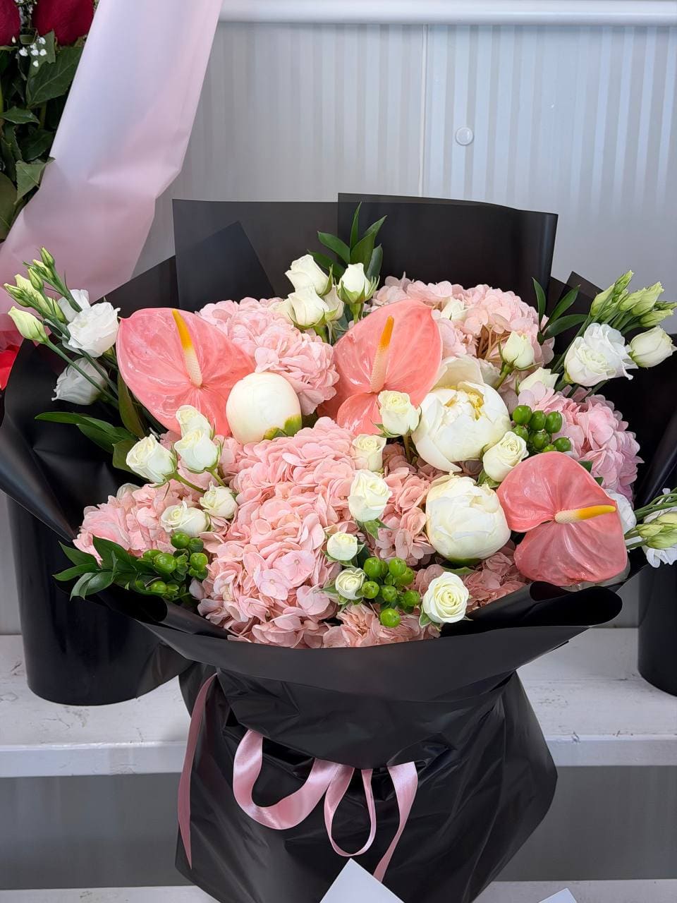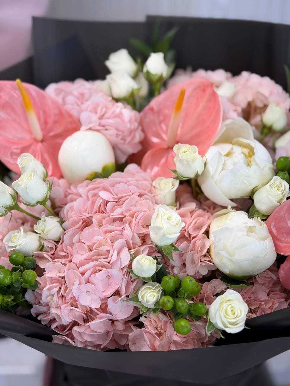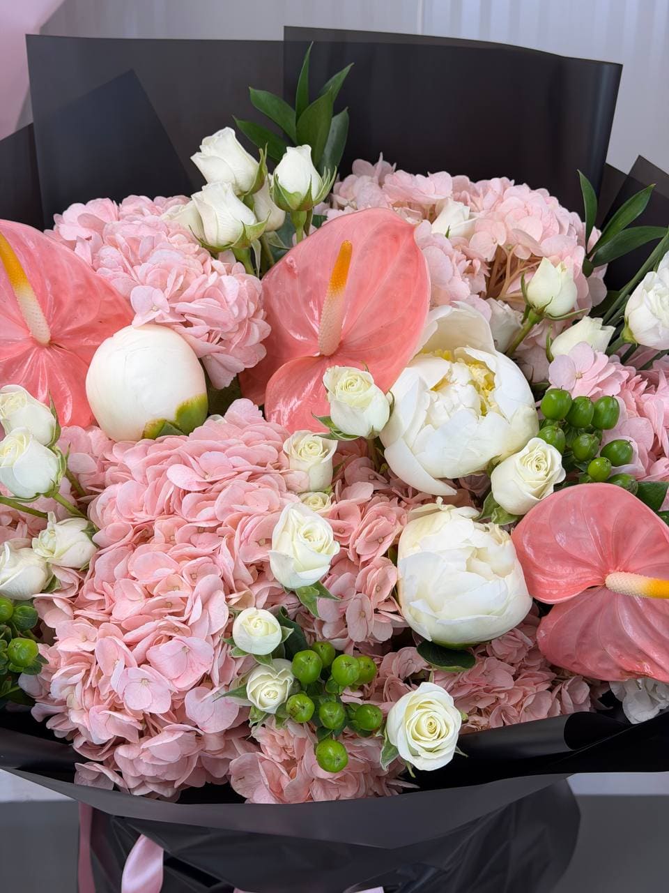 A luxurious bouquet featuring pink hydrangea, white peonies, delicate spray roses, and statement anthuriums, wrapped in elegant black paper. A bold yet romantic arrangement perfect for special occasions.