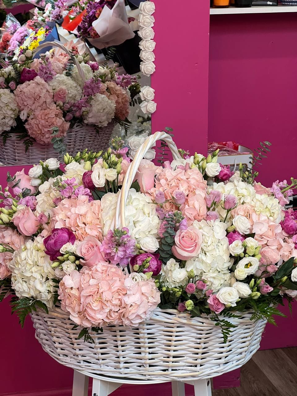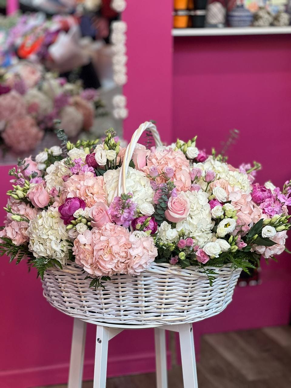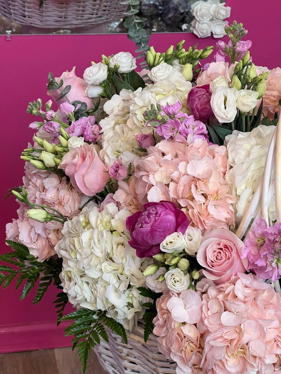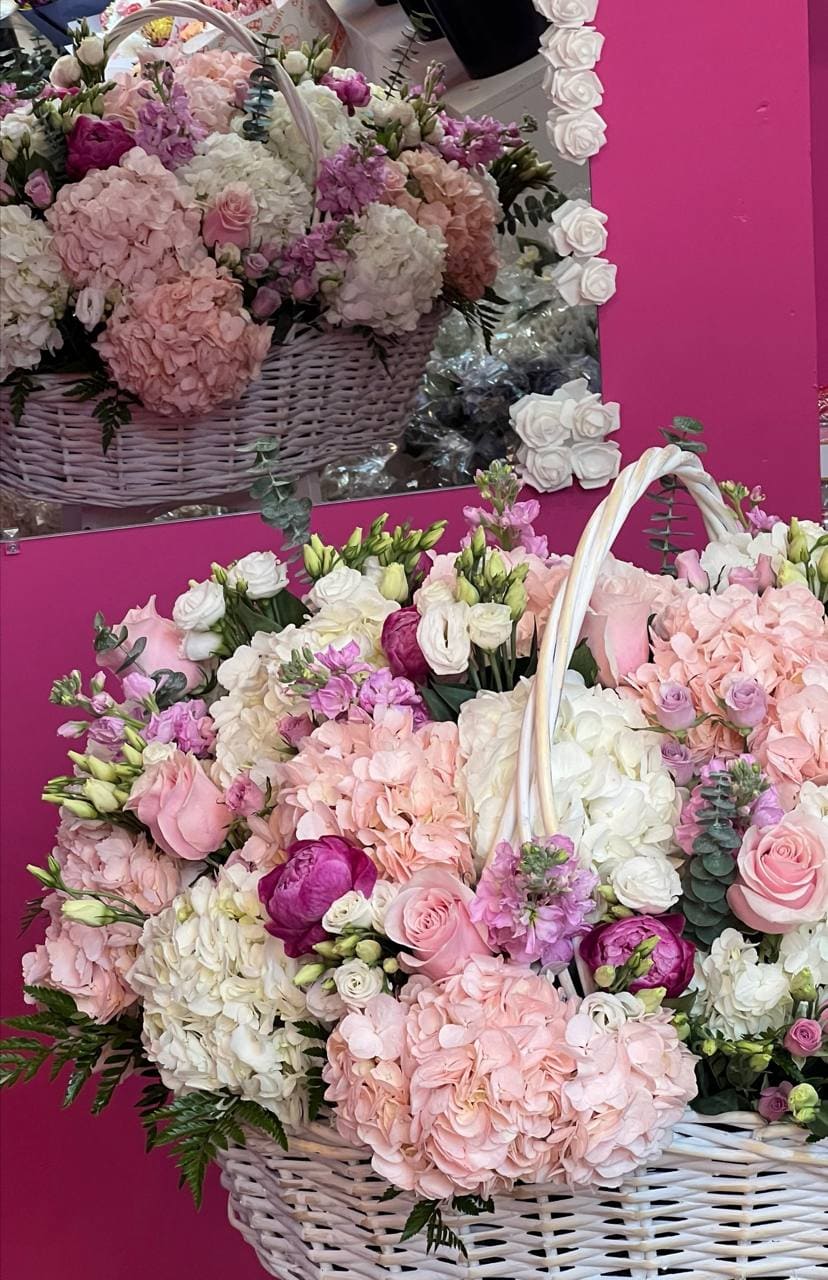The Grand Blush Hydrangea Basket – Luxury Pink & White Flower Arrangement is a luxurious floral arrangement designed to impress. This premium flower basket combines lush hydrangeas with elegant peonies, classic roses, delicate spray roses, and soft lisianthus in romantic shades of blush pink and ivory.