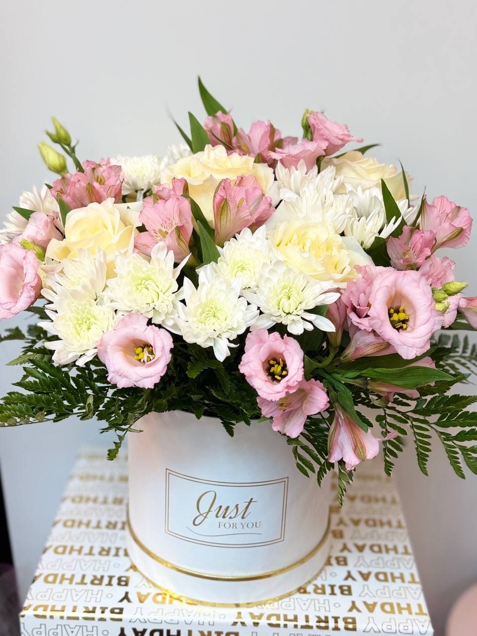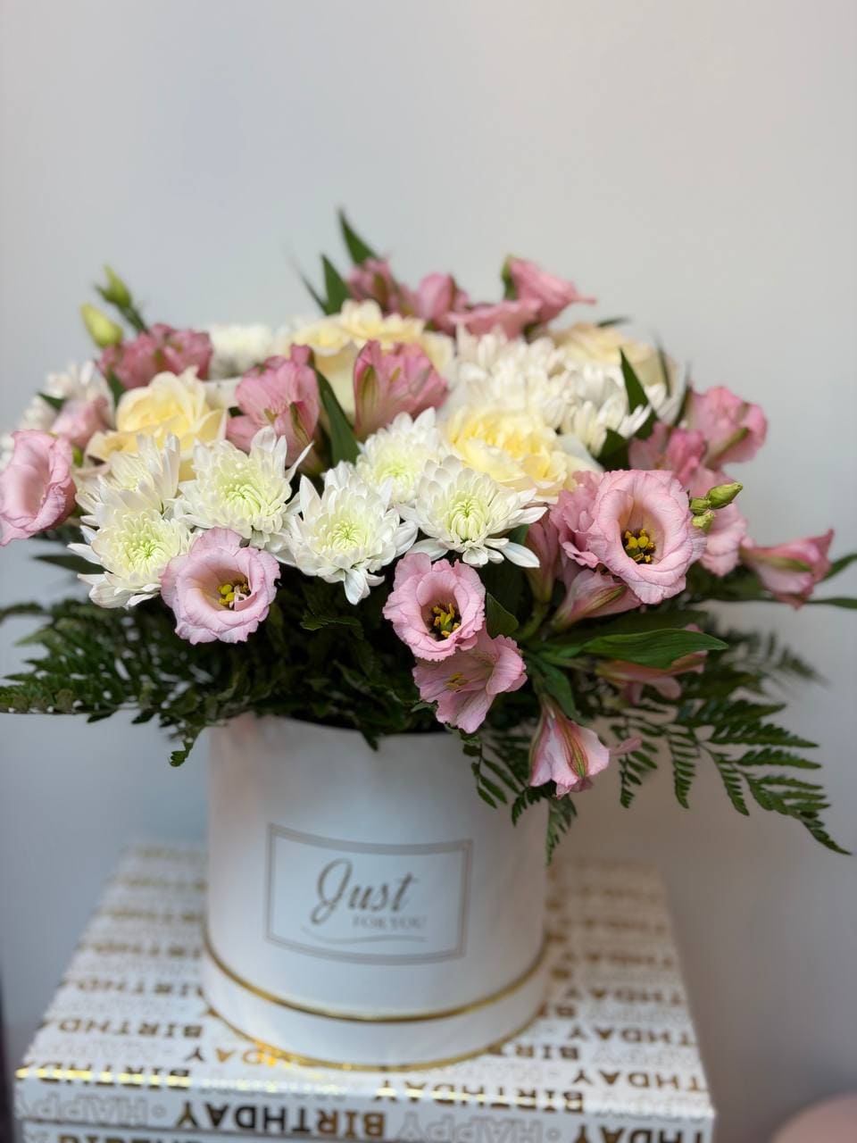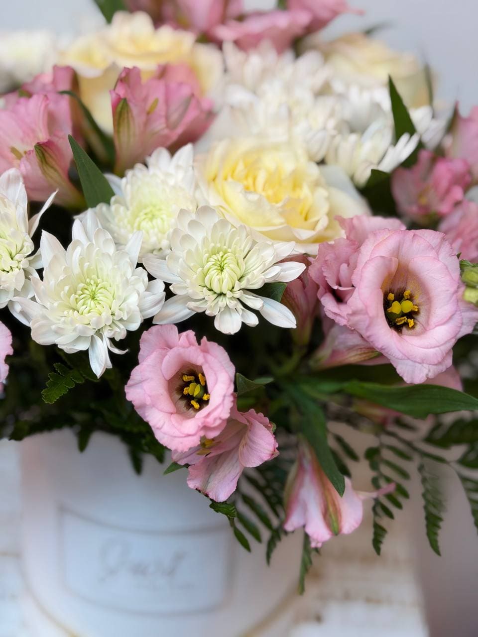 The Lumière Floral Box is a refined pastel arrangement designed for elegant gifting in New York City. Arranged in a stylish hatbox, this bouquet blends soft cream roses with delicate white chrysanthemums, romantic pink lisianthus, and graceful alstroemeria for a timeless and sophisticated presentation.