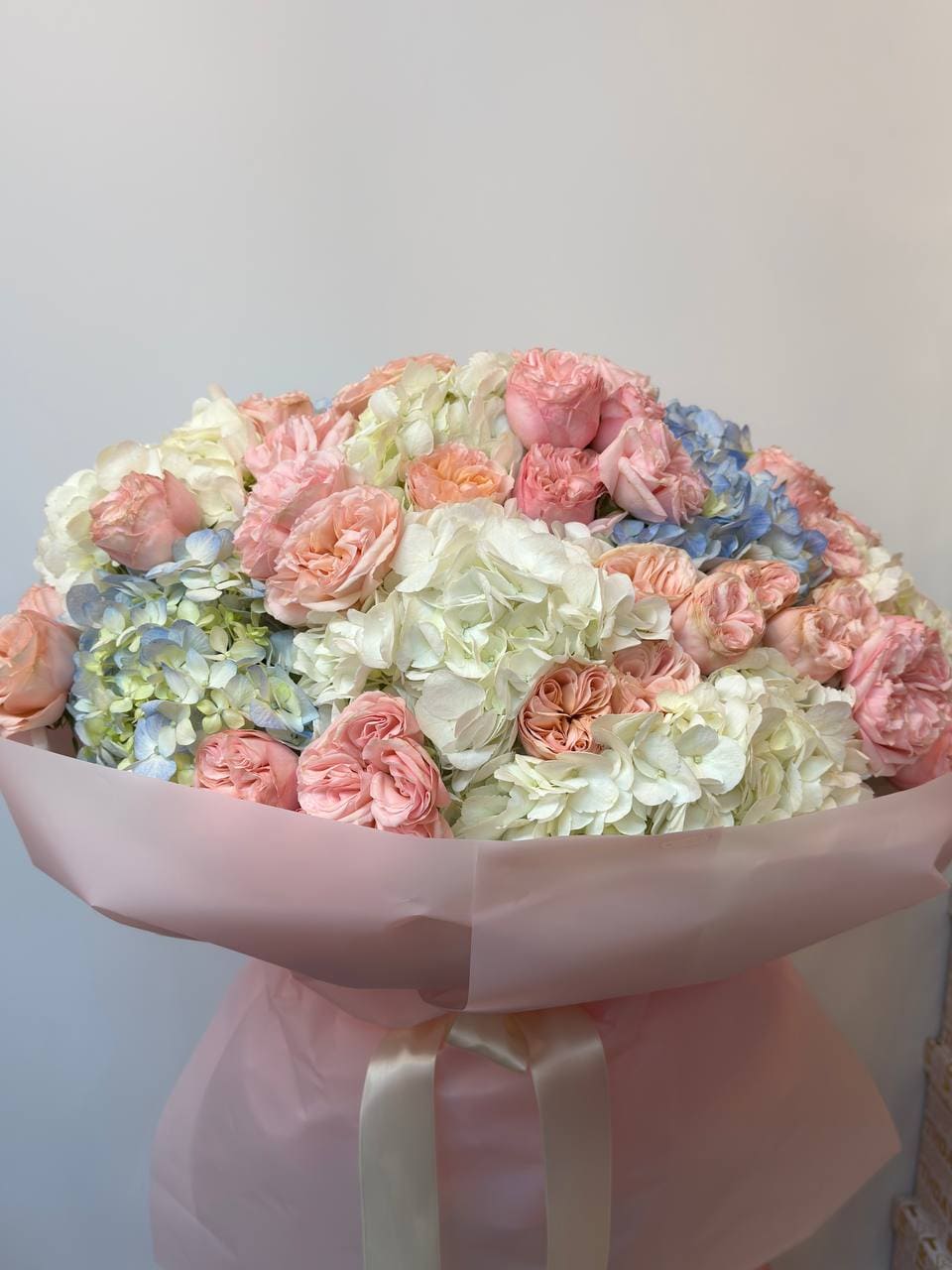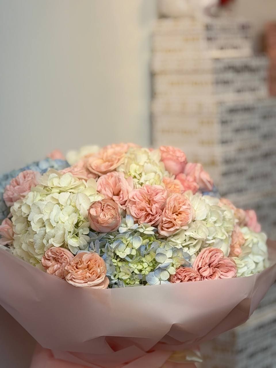 A romantic blend of lush hydrangea and delicate peony-shaped bush roses. Featuring full, layered blooms and soft textures, this arrangement creates a fresh, elegant look perfect for weddings, special occasions, or everyday floral décor.
