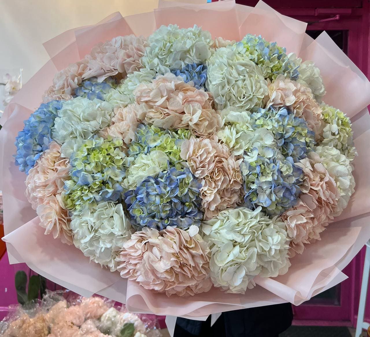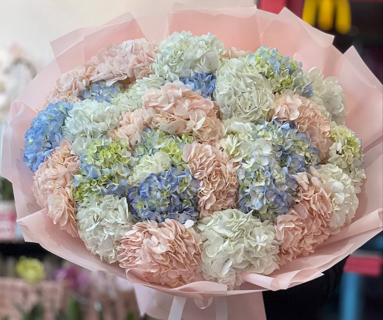 A stunning bouquet of 30 premium hydrangeas in soft pastel shades of blush, ivory, blue, and light green. Lush, voluminous, and effortlessly elegant — a true statement piece for any special occasion.